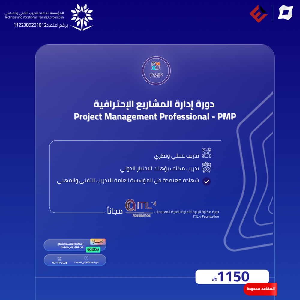 ستُعزز مهاراتك في التخطيط والتنفيذ والمتابعة، وتصبح مؤهلًا لاجتياز اختبار شهادة PMP المعترف بها عالميًا كأهم شهادة في إدارة المشاريع الاحترافية.